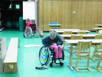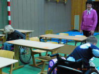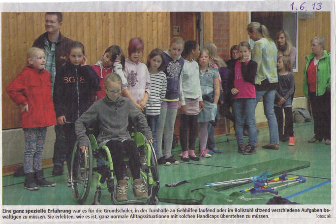 Viele Kinder fuhren in ausgeliehenen Kinder- und Erwachsenenrollstühlen durch ein aufgebautes Klassenzimmer (einschließlich der normalen Unordnung). Sie entdeckten Hindernisse im Klassenraum, in der Schule und in der Fußgängerzone.