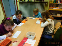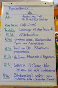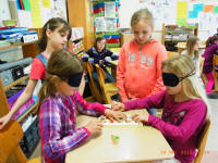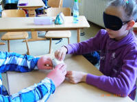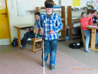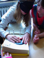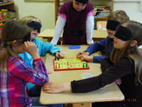 Andere Kinder versetzten sich mit Hilfe von Schwarzbrillen in die Situation blinder Kinder, beschäftigten sich mit der Blindenschrift und bastelten Spiele. Sie spielten u.a. blind "Mühle", "Mensch ärgere dich nicht", "Memory" und mit dem Klingelball. Sie entdeckten, dass das Erkennen von Gegenständen und auch das Essen ohne Sehen sehr schwierig ist.